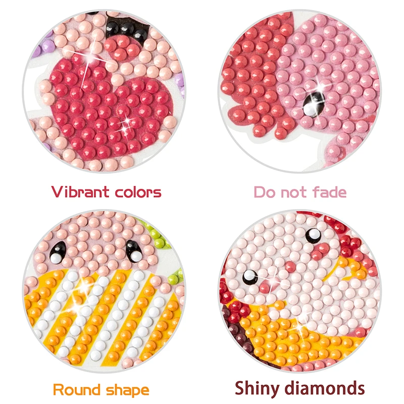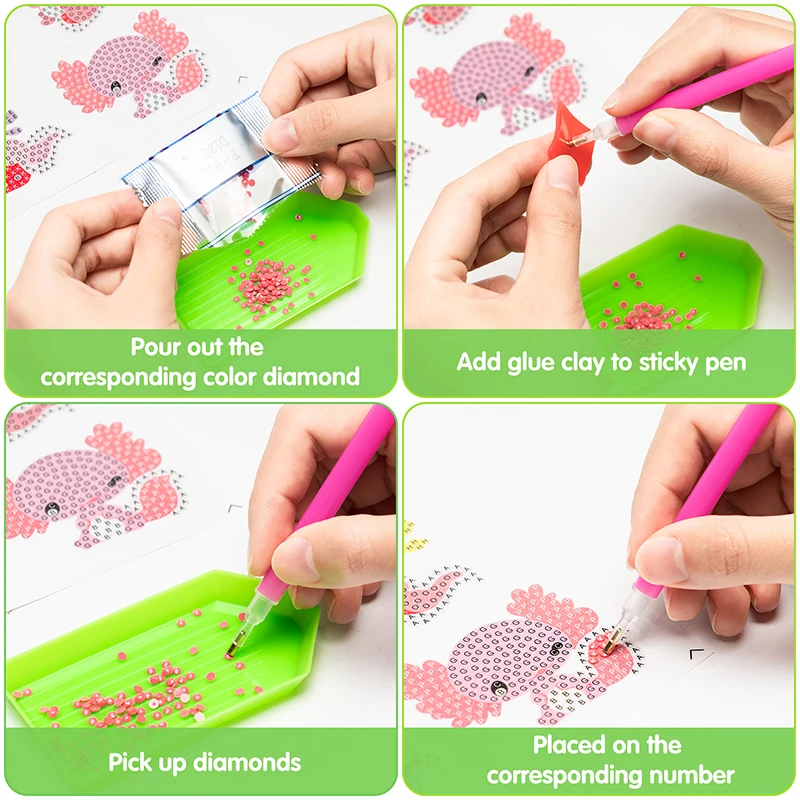 The Package Including:The package comes with 12 patterns of stickers and 1 set of diamond bags of corresponding colors, 1 sticky pen, 1 diamond tray, and 1 glue clay.