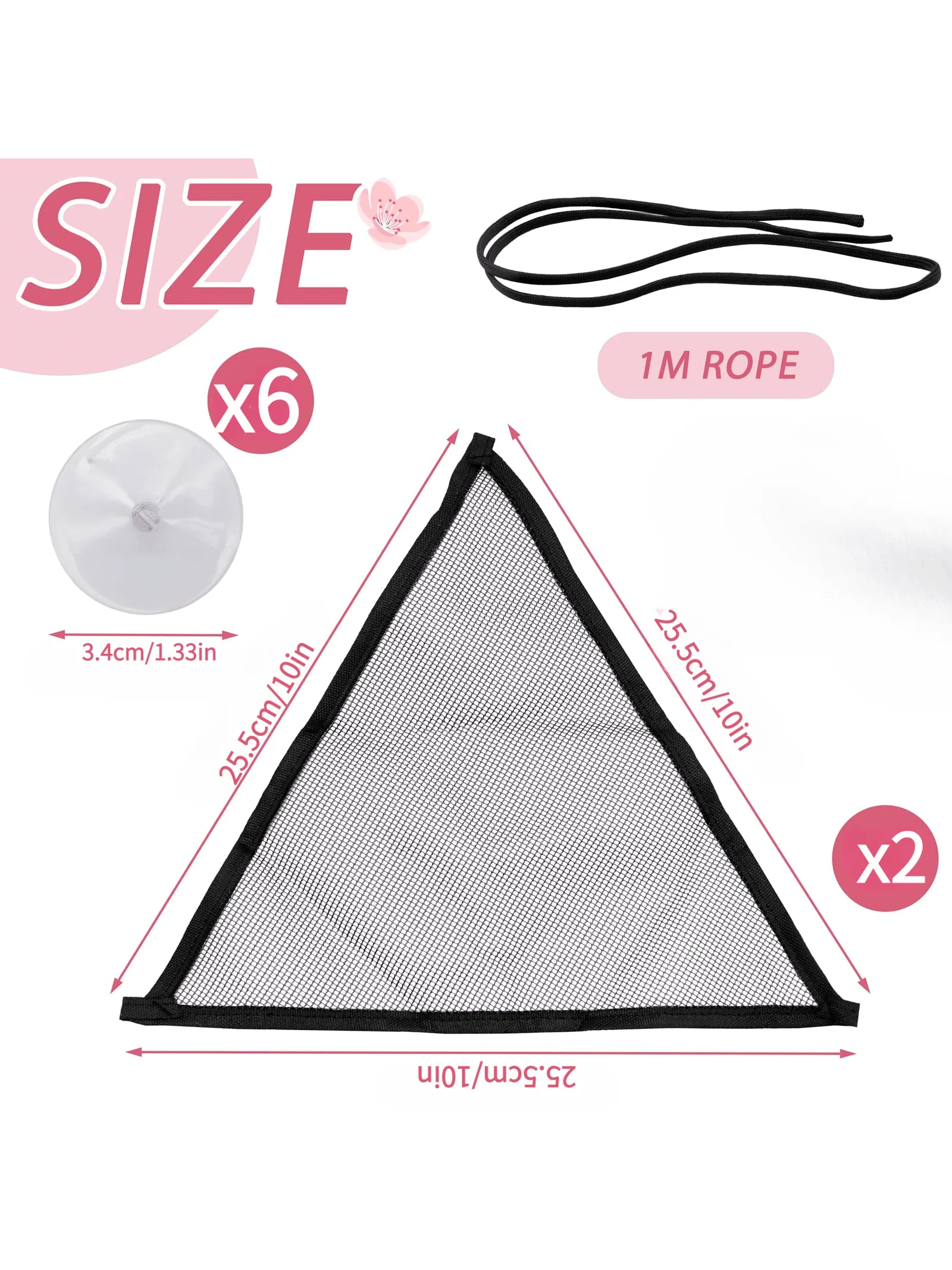 【Packaging Contents】: 2 triangular net bags + 6 suction cups + 1 meter of rope
