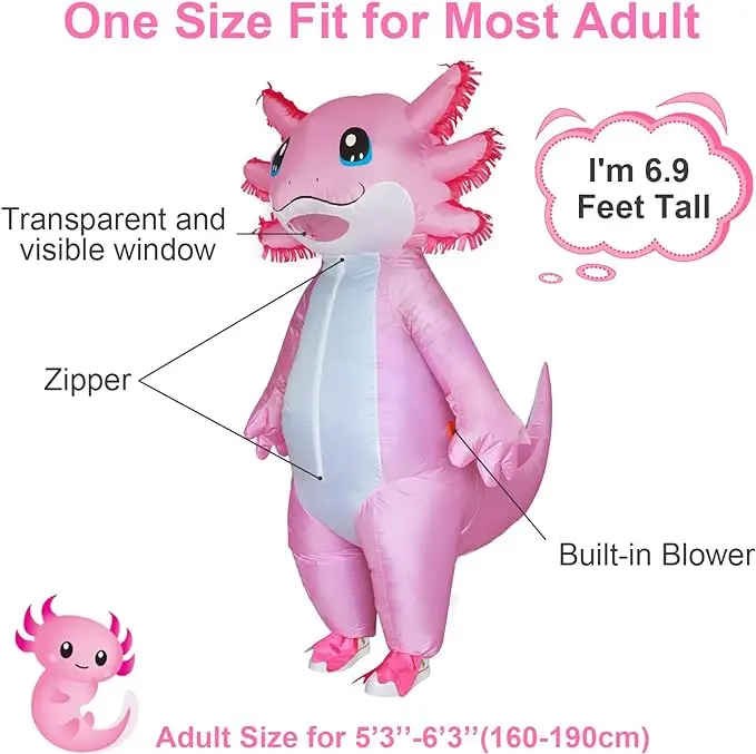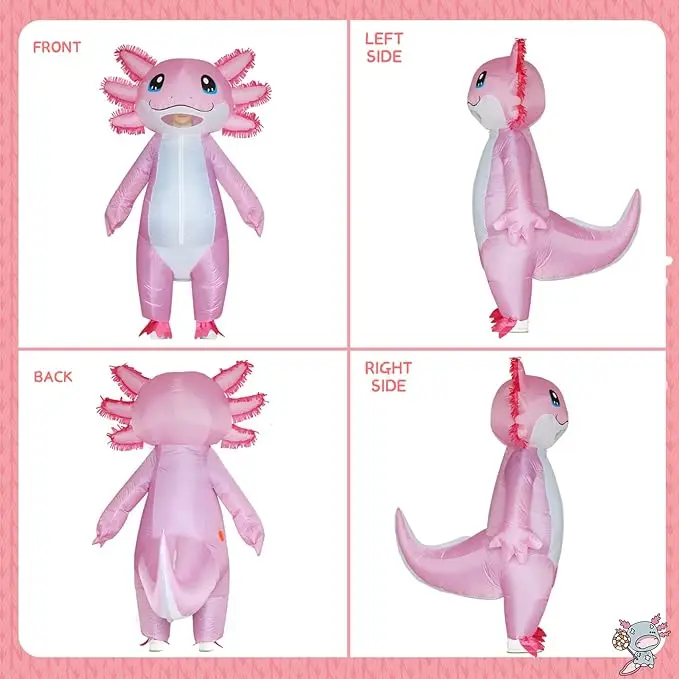 Step into the whimsical world of our Inflatable Pink Axolotl Costume! This charming cosplay costume features a delightful design of a pink axolotl with exaggerated features like big, expressive eyes, a gentle smile, and adorable external gills. The vibrant pink color and detailed patterns bring the playful spirit of an axolotl to life, making it perfect for Halloween or any cosplay event.